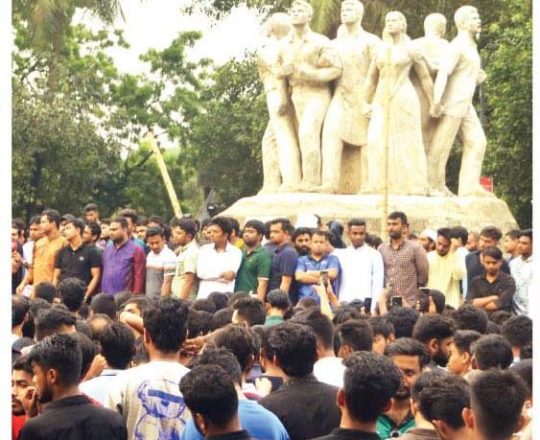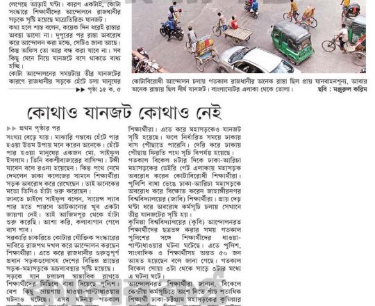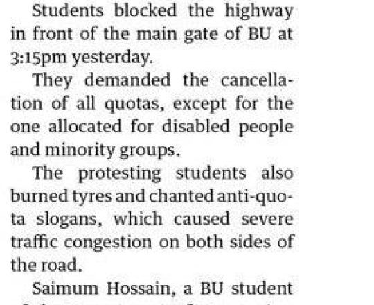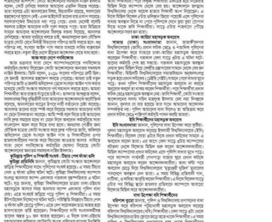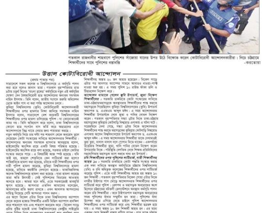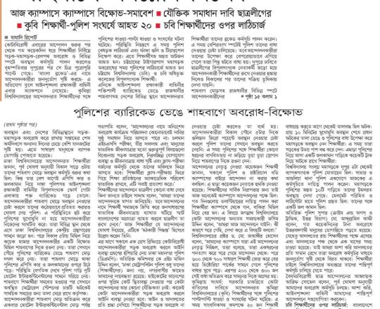 প্রথম আলো, ১২ জুলাই, সরকারি চাকরিতে কোটা সংস্কারের দাবিতে জগন্নাথের শিক্ষার্থীদের বিক্ষোভ মিছিল