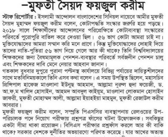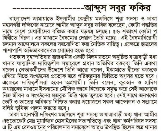 দৈনিক সংগ্রাম, ১২ জুলাই ২০২৪, কোটা পদ্ধতির নামে দেশে মেধাবীদের বঞ্চিত করার ষড়যন্ত্র চলছে-আব্দুস সবুর ফকির