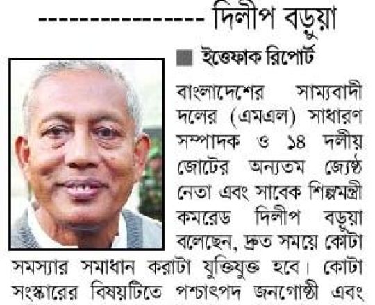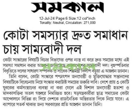 সমকাল, ১২ জুলাই ২০২৪, কোটা সমস্যার দ্রুত সমাধান চায় সাম্যবাদী দল
