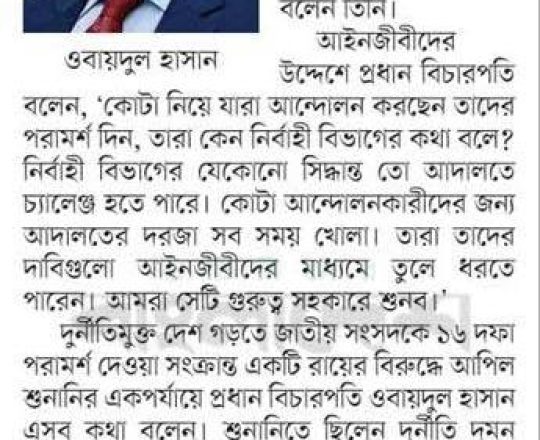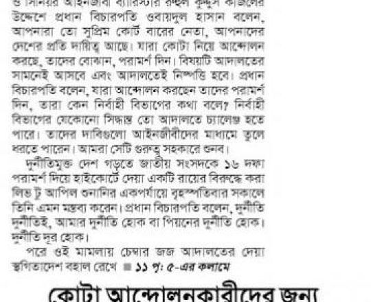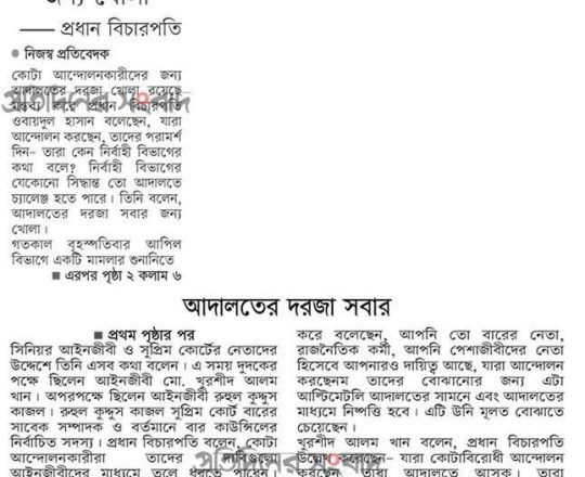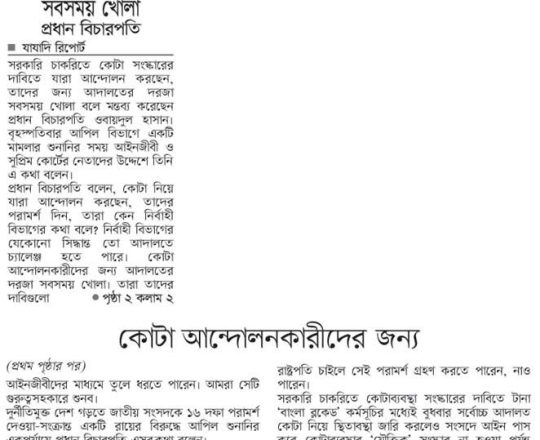 দৈনিক সংগ্রাম, ১২ জুলাই ২০২৪, কোটা আন্দোলনকারীদের জন্য আদালতের দরজা সবসময় খোলা-প্রধান বিচারপতি