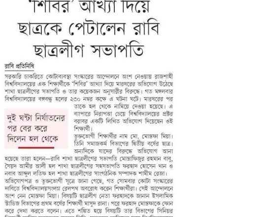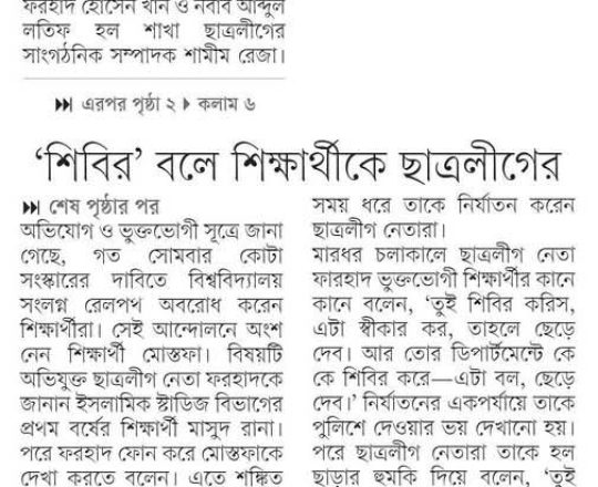 প্রথম আলো, ১২ জুলাই, ছাত্রলীগের মারধরের শিকার শিক্ষার্থী নিরাপত্তা না পেলে ক্যাম্পাসে ফিরতে চান না