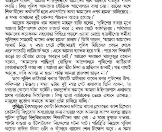 প্রথম আলো, ১২ জুলাই, কুমিল্লা বিশ্ববিদ্যালয়ে শিক্ষার্থীদের সঙ্গে পুলিশের পাল্টাপাল্টি ধাওয়া, ফাঁকা গুলি