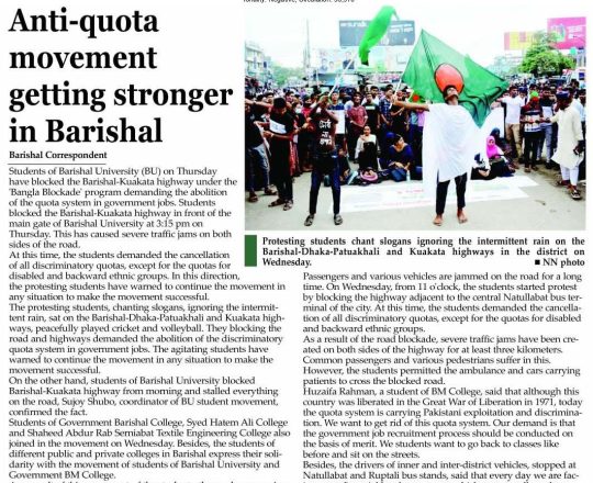 New Nation, 12 july 2024, Anti-quota movement getting stronger in Barishal