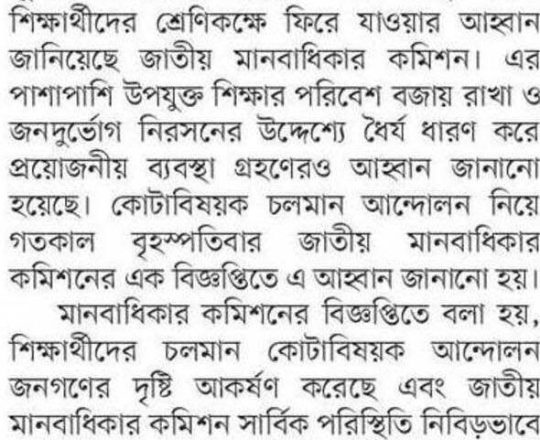 প্রথম আলো, ১২ জুলাই ২০২৪, শিক্ষার্থীদের শ্রেণিকক্ষে ফিরে যাওয়ার আহ্বান মানবাধিকার কমিশনের