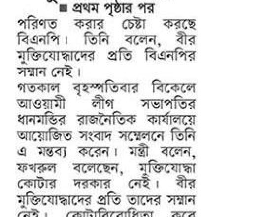 প্রতিদিনের সংবাদ, ১২ জুলাই ২০২৪, মুক্তিযোদ্ধাদের প্রতি বিএনপির সম্মান নেই-সড়কমন্ত্রী