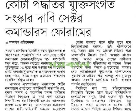 সমকাল, ১২ জুলাই ২০২৪, কোটা পদ্ধতির যুক্তিসংগত সংস্কার দাবি সেক্টর কমান্ডারস ফোরামের
