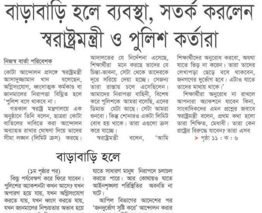 প্রথম আলো, ১২ জুলাই ২০২৪, শিক্ষার্থীরা 'লিমিট ক্রস' করে যাচ্ছেন: স্বরাষ্ট্রমন্ত্রী