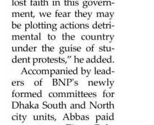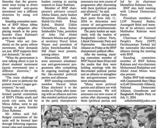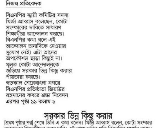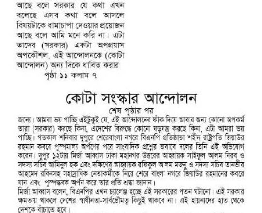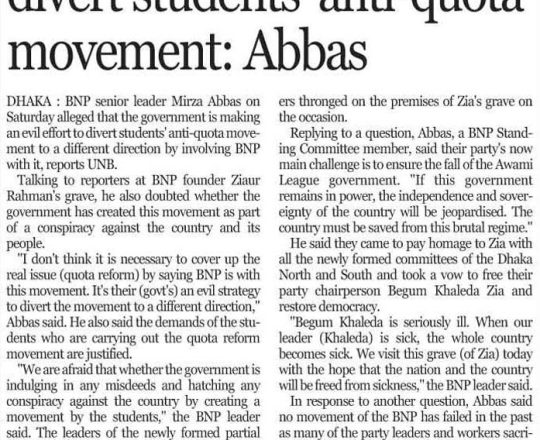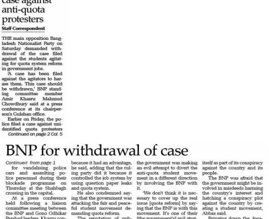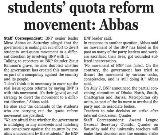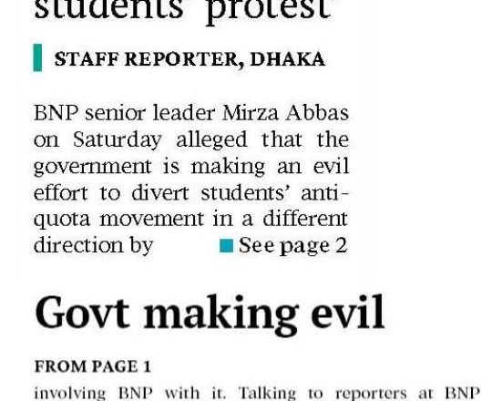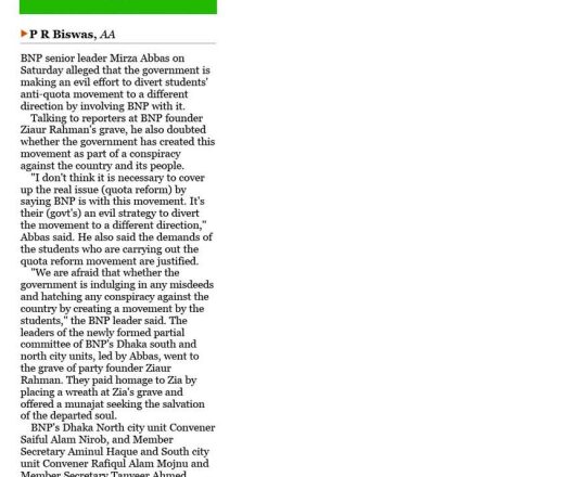 Asian Age, 14 july 2024, Govt making evil effort to divert students' anti-quota movement: BNP
