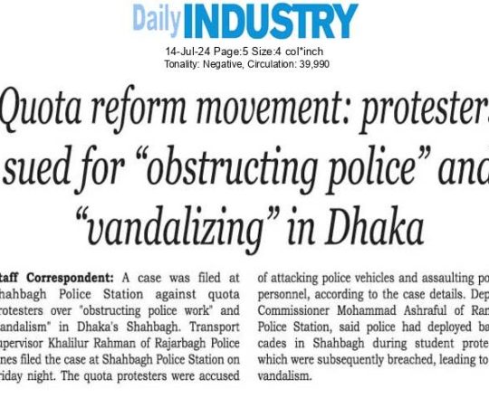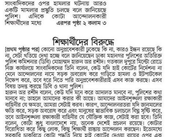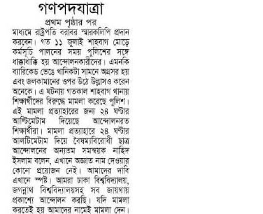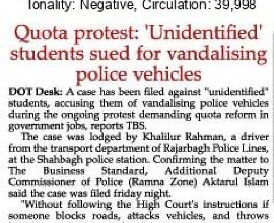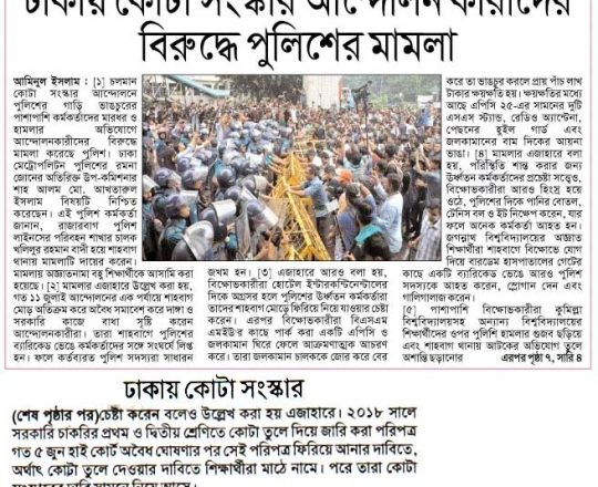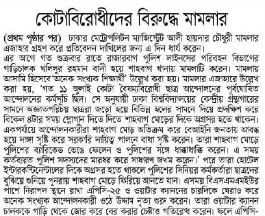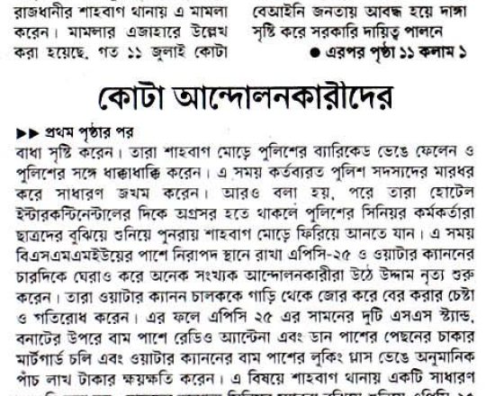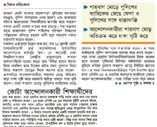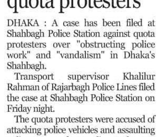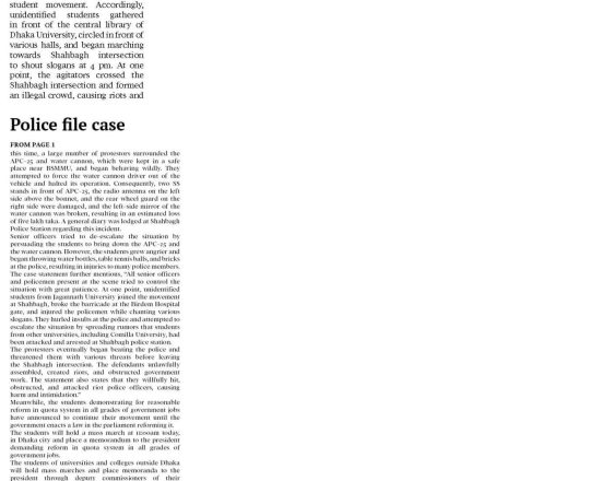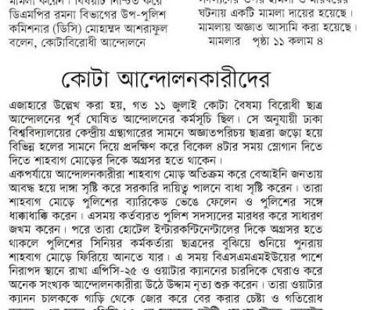 আমাদের অর্থনীতি, ১৪ জুলাই ২০২৪, ঢাকায় কোটা সংস্কার আন্দোলন কারীদের বিরুদ্ধে পুলিশের মামলা
