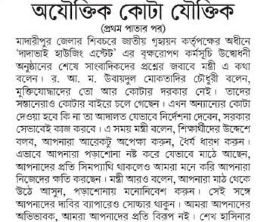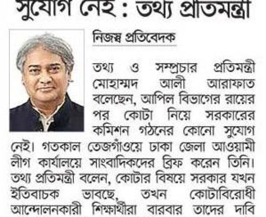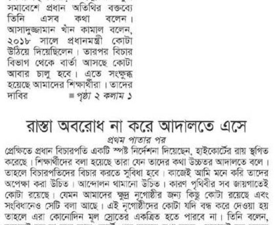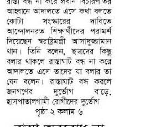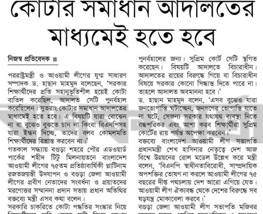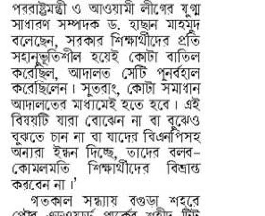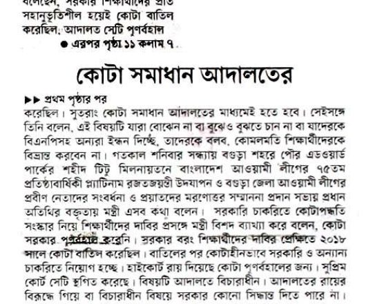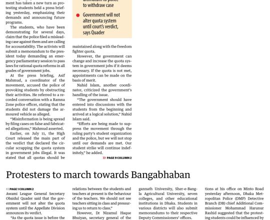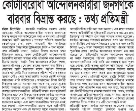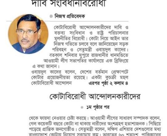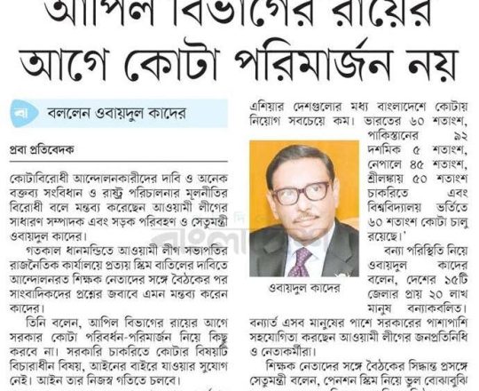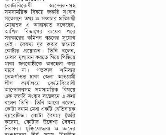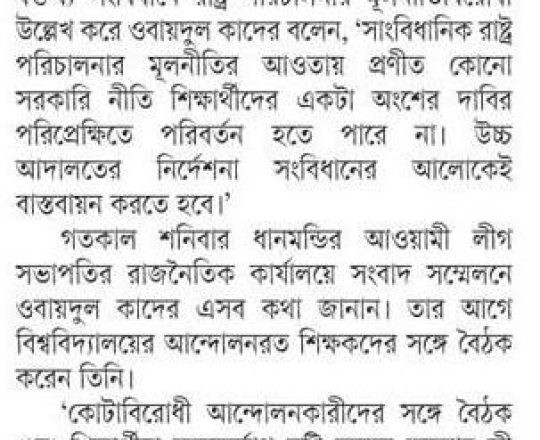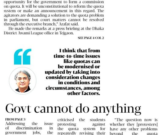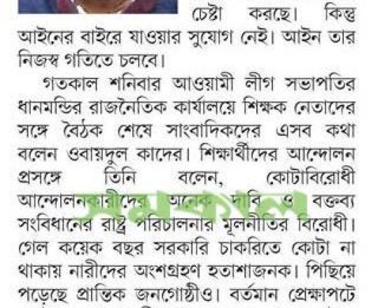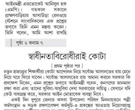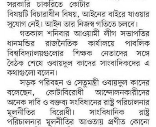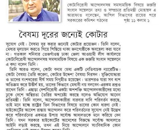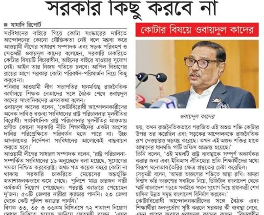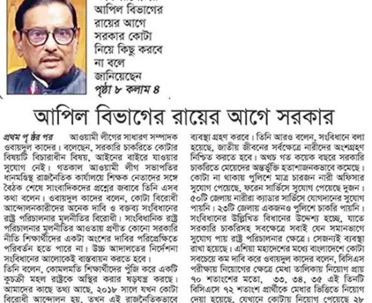 প্রথম আলো, ১৪ জুলাই, Govt won’t do anything on quota before Appellate Division’s verdict: Quader