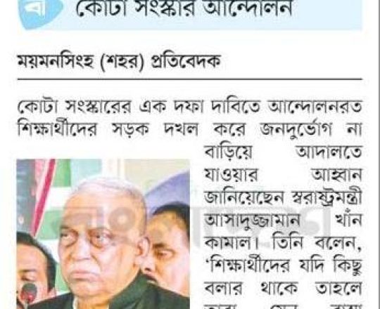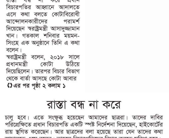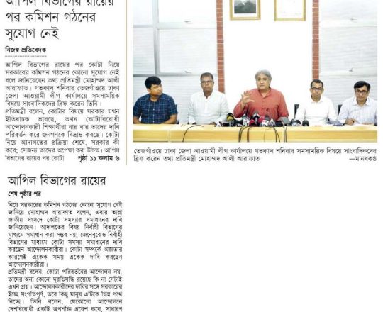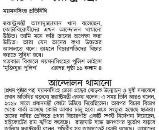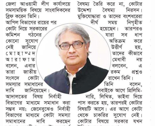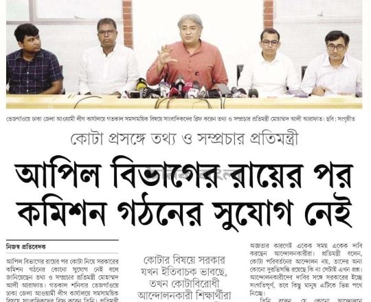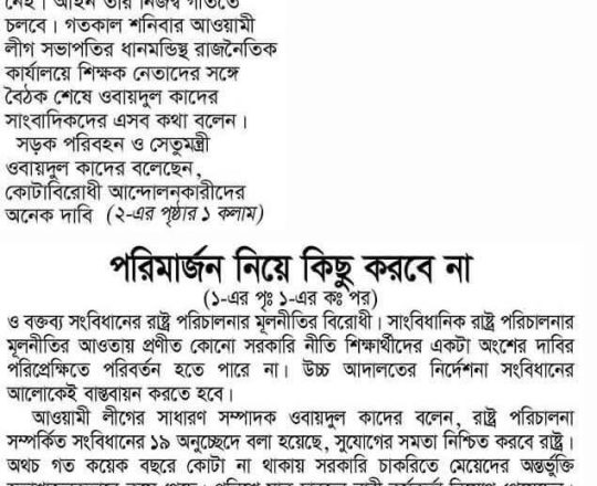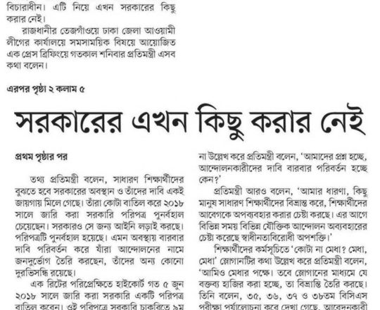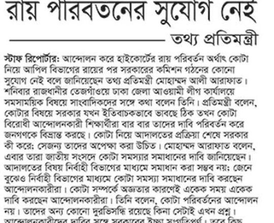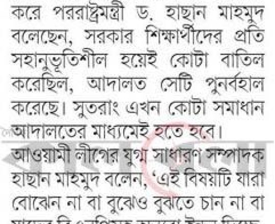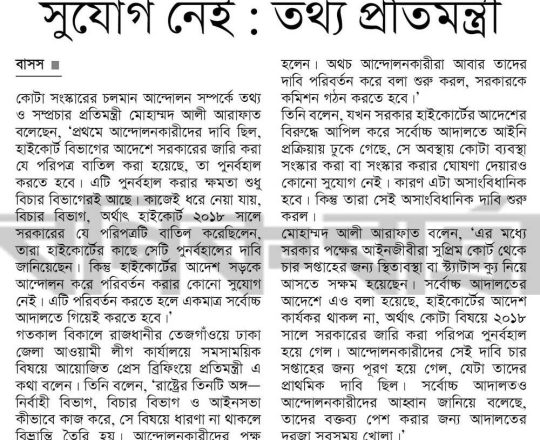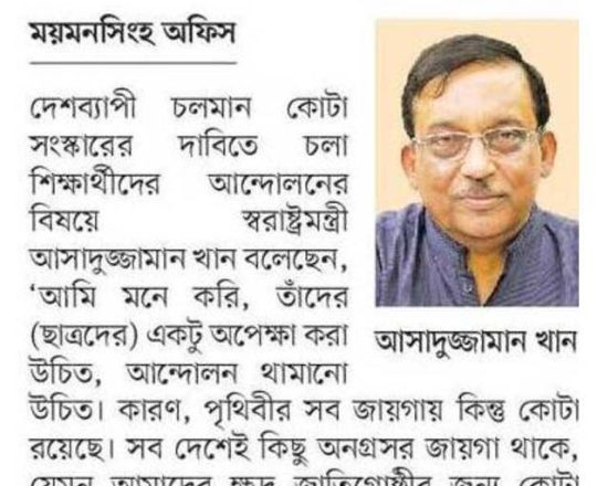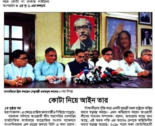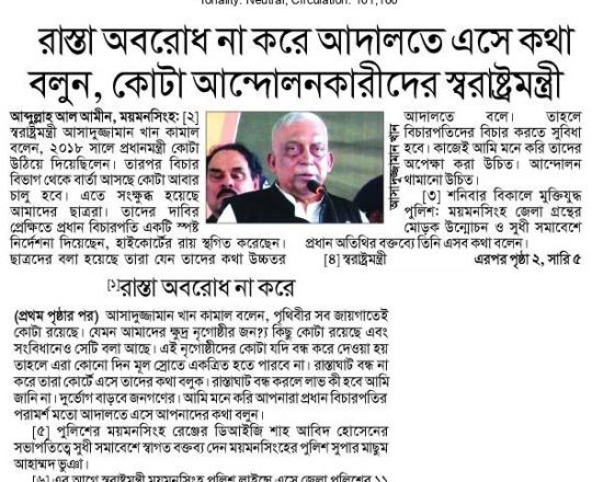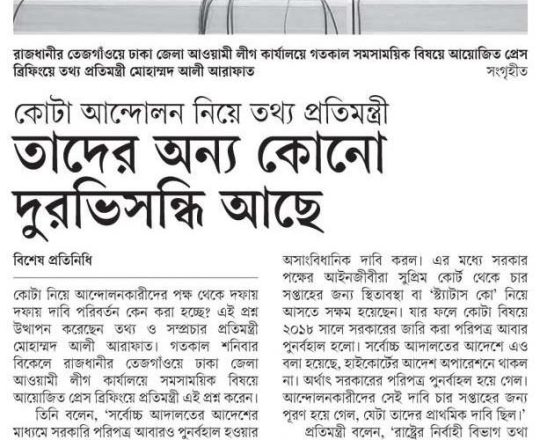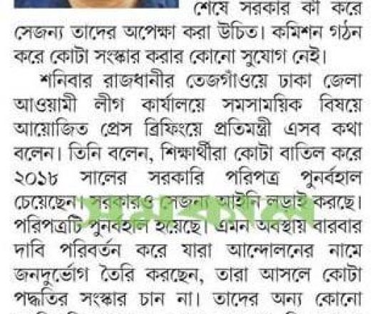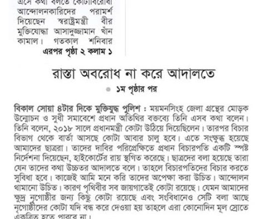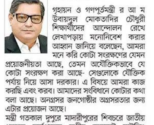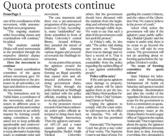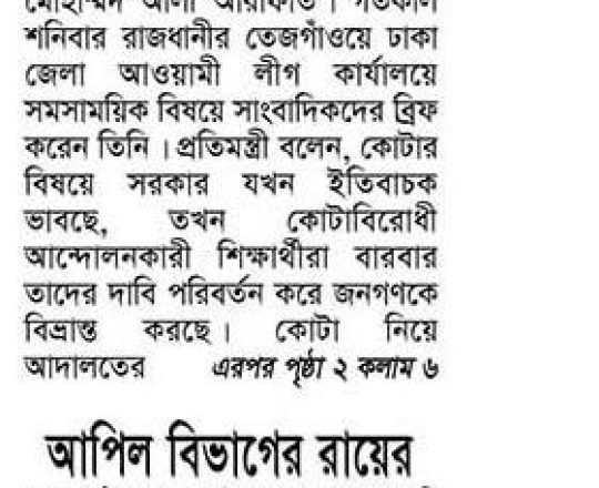 প্রথম আলো, ১৪ জুলাই, Govt won’t do anything on quota before Appellate Division’s verdict: Quader