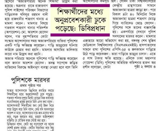 প্রথম আলো, ১৪ জুলাই ২০২৪, পুলিশকে মারধর ও গাড়ি ক্ষতিগ্রস্ত করার অভিযোগে মামলা