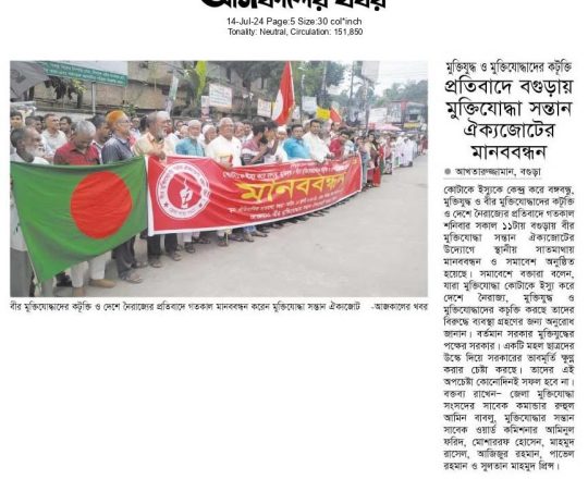 আজকালের খবর, ১৪ জুলাই ২০২৪, প্রতিবাদে বগুড়ায় মুক্তিযোদ্ধা সন্তান ঐক্যজোটের মানববন্ধন