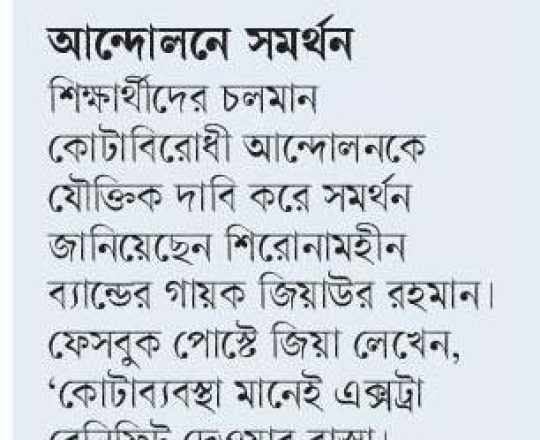 আজকের পত্রিকা, ১৪ জুলাই ২০২৪, যৌক্তিক দাবি করে সমর্থন জানিয়েছেন শিরোনামহীন ব্যান্ডের গায়ক জিয়াউর রহমান