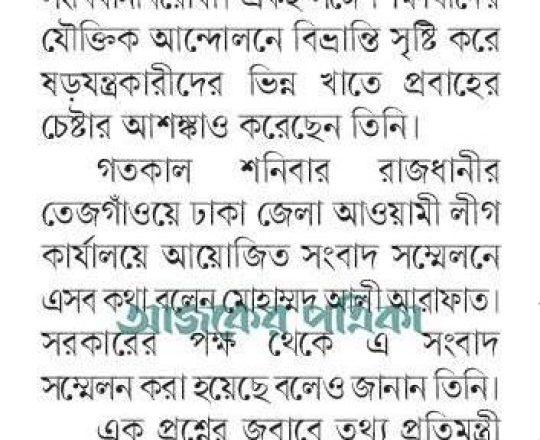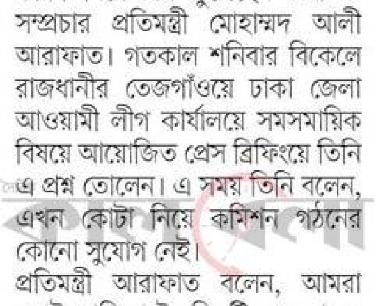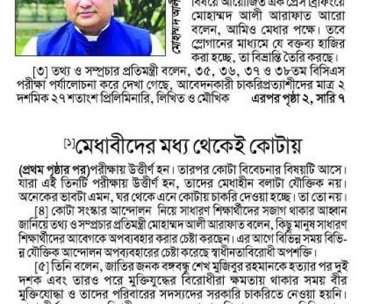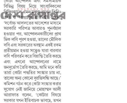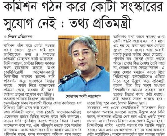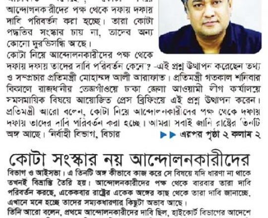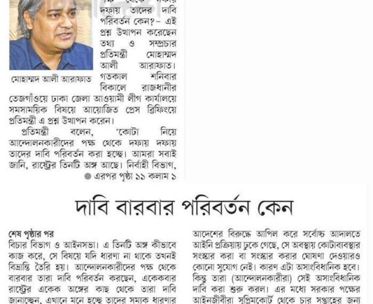 প্রথম আলো, ১৪ জুলাই, Arafat finds motive in changing demands of quota protesters
