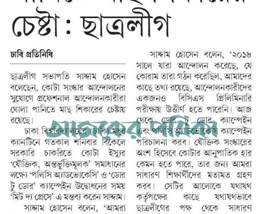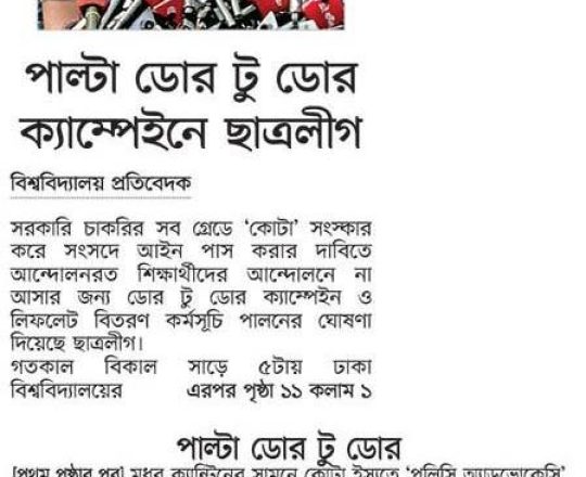 বাংলাদেশ প্রতিদিন, ১৪ জুলাই ২০২৪, পাল্টা ডোর টু ডোর ক্যাম্পেইনে ছাত্রলীগ