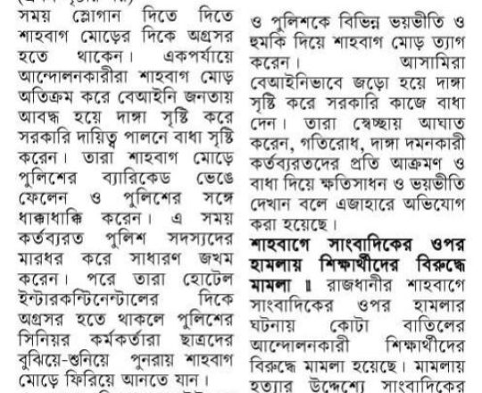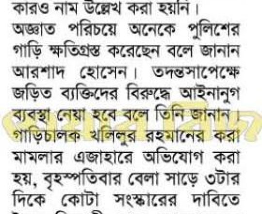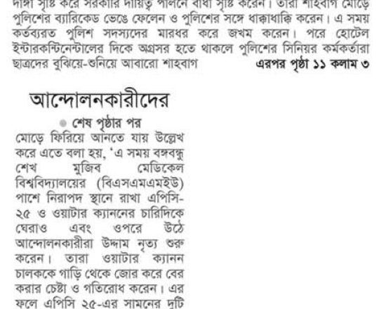 দৈনিক সংগ্রাম, ১৪ জুলাই ২০২৪, পুলিশকে মারধর ও গাড়ি ভাঙচুরের অভিযোগে মামলা -আসামী অজ্ঞাত