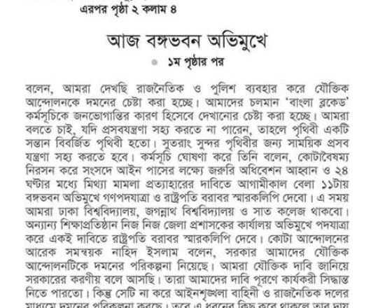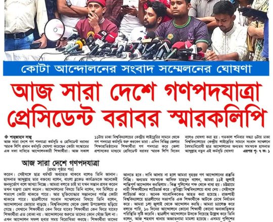 ভোরের পাতা, ১৪ জুলাই ২০২৪, আজ গণপদযাত্রা ও রাষ্ট্রপতি বরাবর স্মারকলিপি