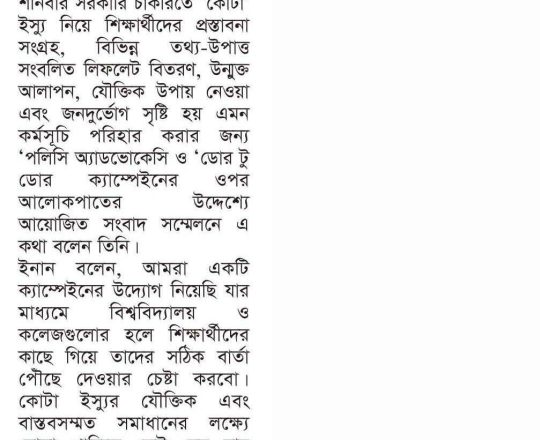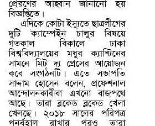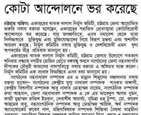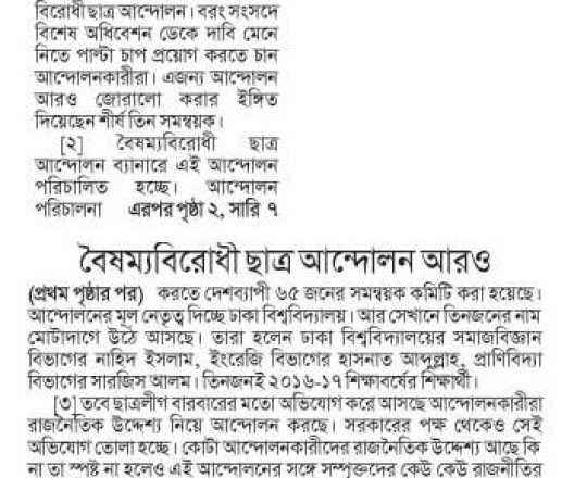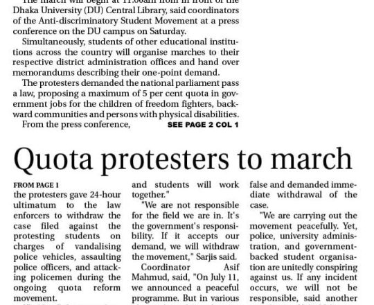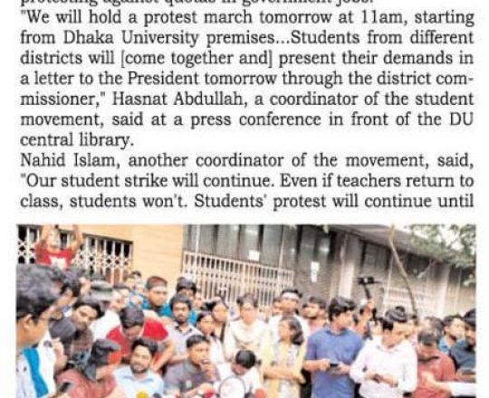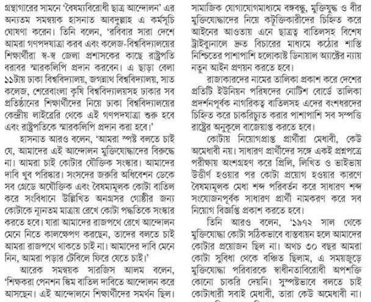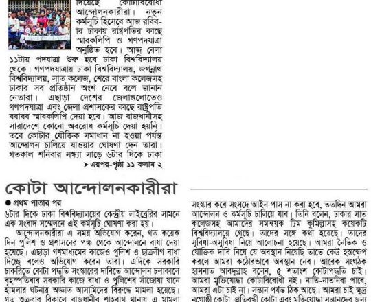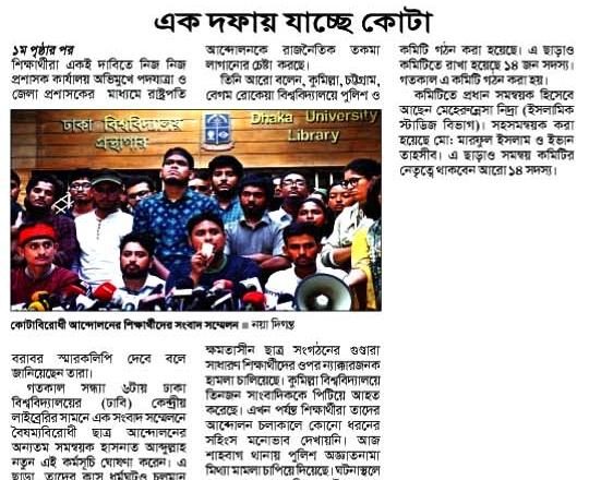 প্রথম আলো, ১৪ জুলাই, রাতে ঢাকা বিশ্ববিদ্যালয়ের হলের কক্ষে কক্ষে কোটাব্যবস্থা নিয়ে প্রচারপত্র দিলেন ছাত্রলীগের শীর্ষ নেতারা