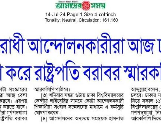 আমাদেরনতুন সময়, ১৪ জুলাই ২০২৪, কোটাবিরোধী আন্দোলনকারীরা আজ ঢাবি থেকে গণপদযাত্রা করে রাষ্ট্রপতি বরাবর স্মারকলিপি দেবে