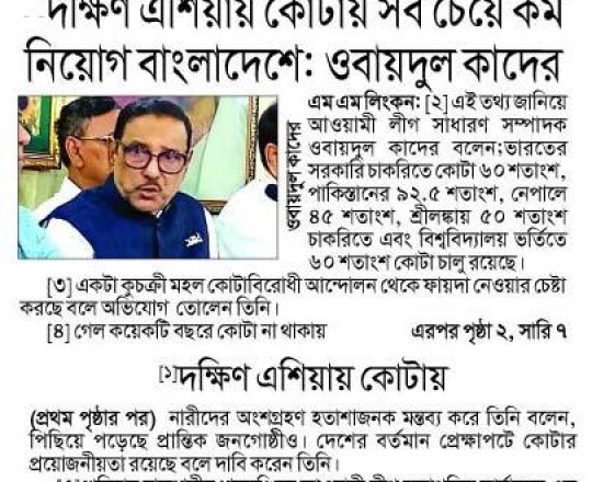 আমাদেরনতুন সময়, ১৪ জুলাই ২০২৪, দক্ষিণ এশিয়ায় কোটায় সব চেয়ে কম নিয়োগ বাংলাদেশে: ওবায়দুল কাদের
