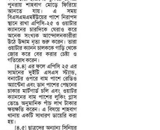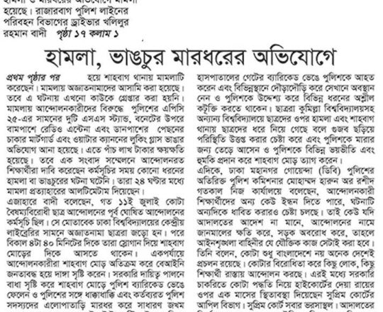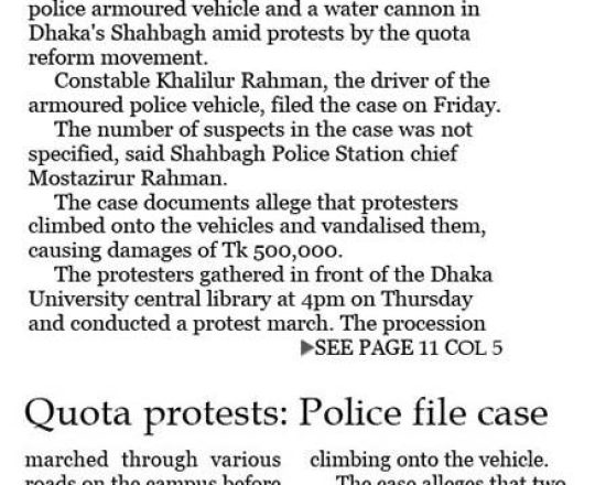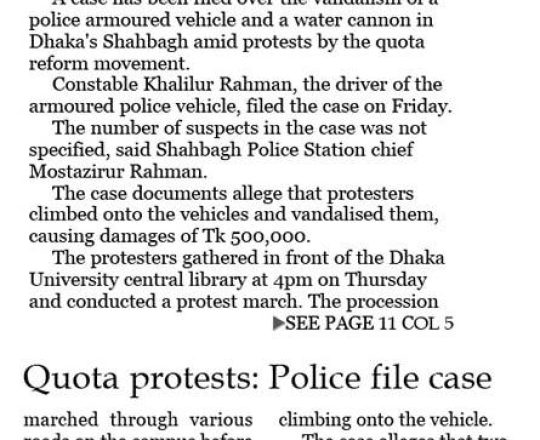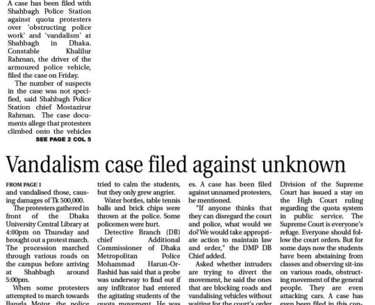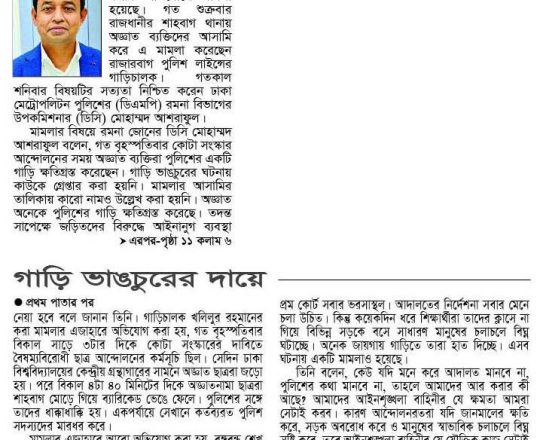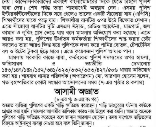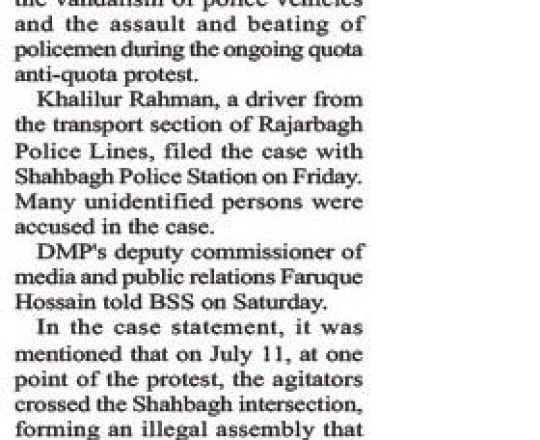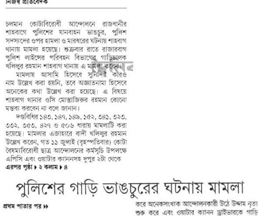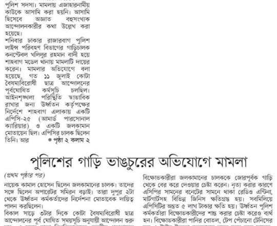 Bangladesh Post, 14 july 2024, Case filed for attacking police, ransacking vehicles