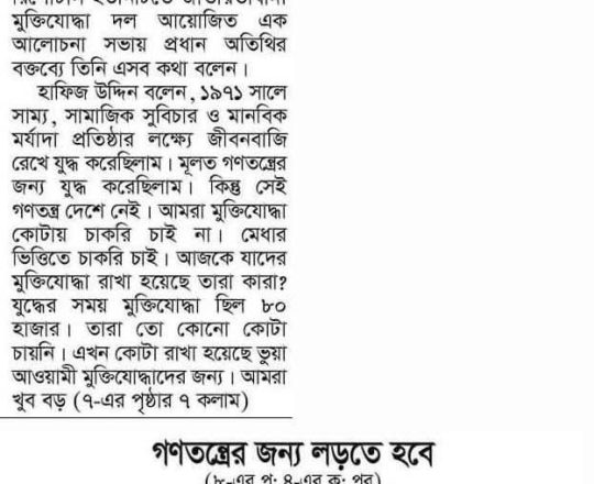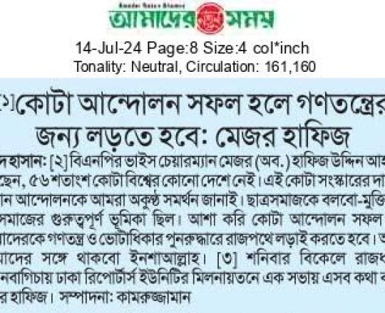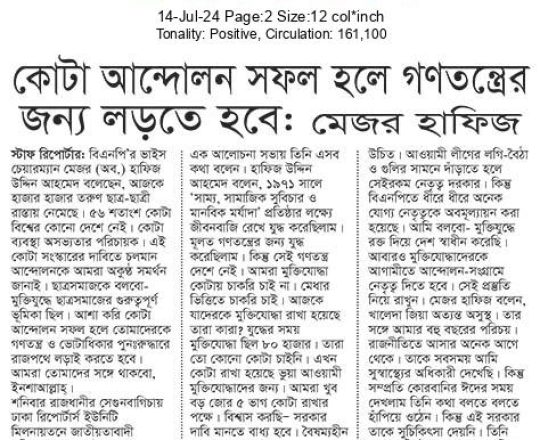 দৈনিক সংগ্রাম, ১৪ জুলাই ২০২৪, কোটা আন্দোলনের পর গণতন্ত্রের জন্য লড়তে হবে -মেজর হাফিজ