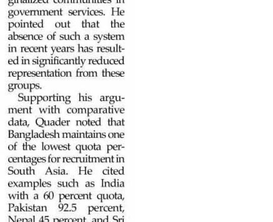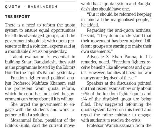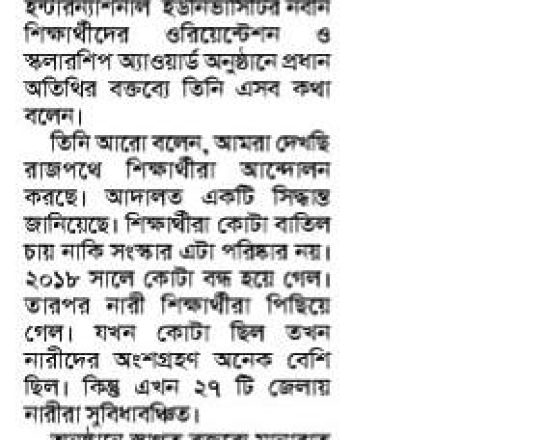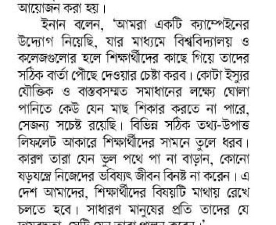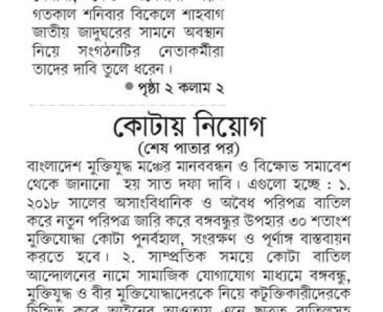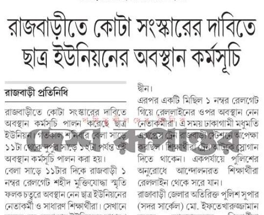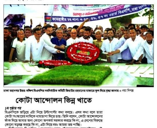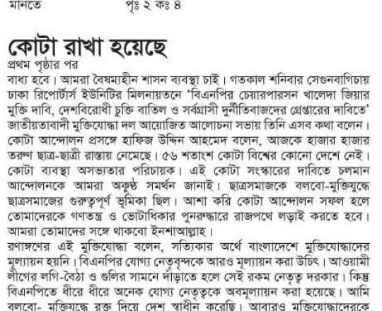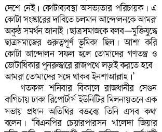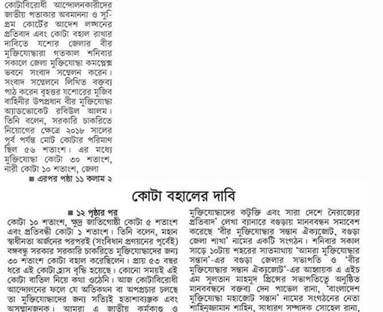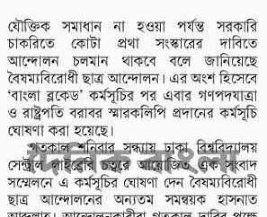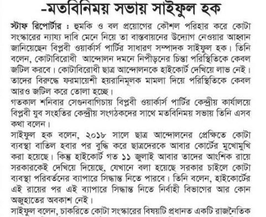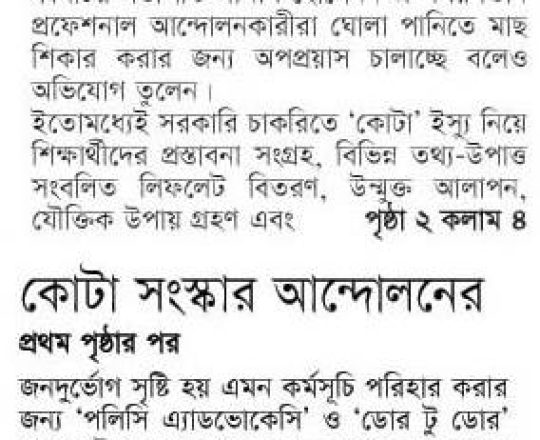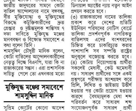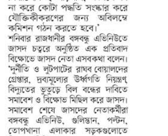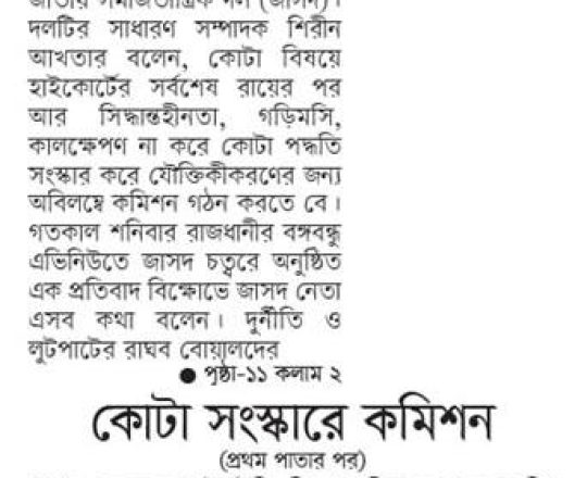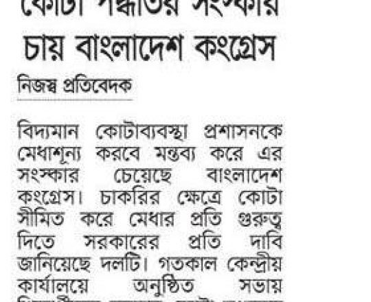 বাংলাদেশ প্রতিদিন, ১৪ জুলাই ২০২৪, কোটা পদ্ধতির সংস্কার চায় বাংলাদেশ কংগ্রেস