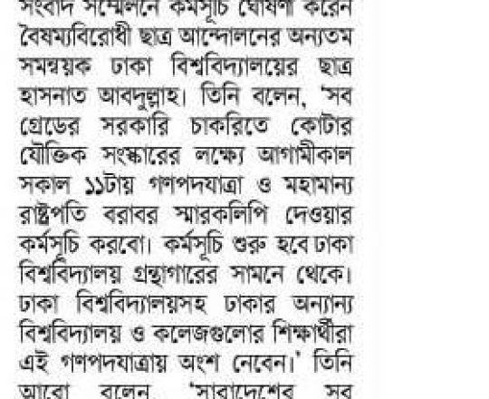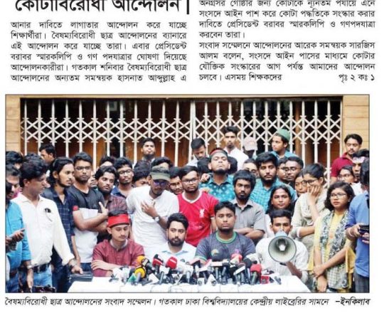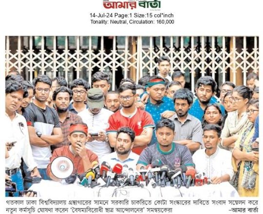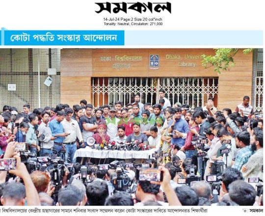 সমকাল, ১৪ জুলাই ২০২৪, সংবাদ সম্মেলন করেন কোটা সংস্কারের দাবিতে আন্দোলনরত শিক্ষার্থীরা
