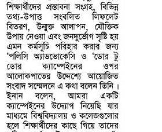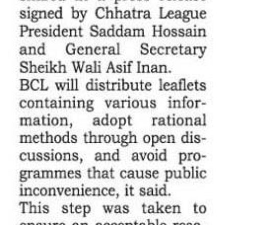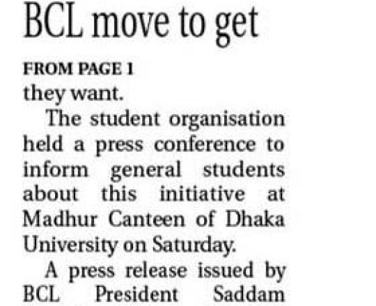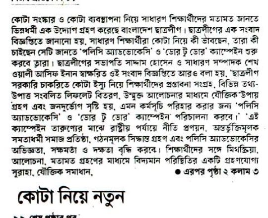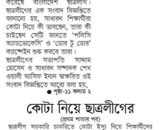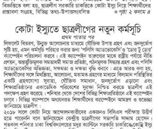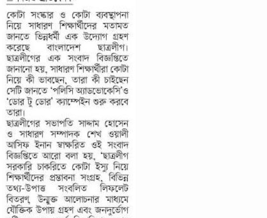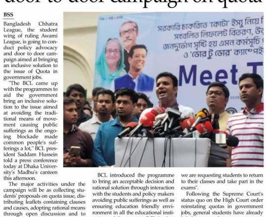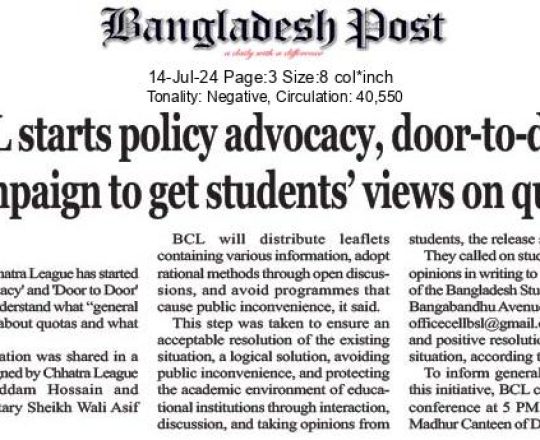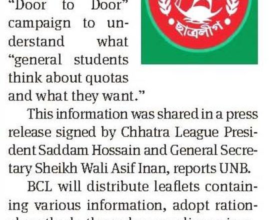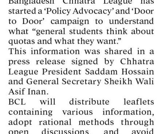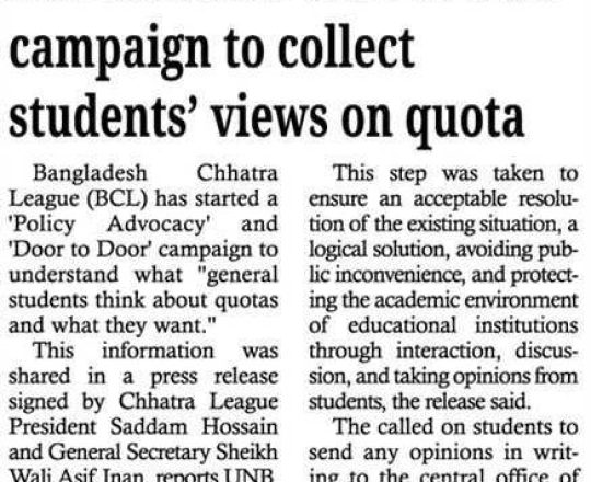 Bangladesh Post, 14 july 2024, BCL starts policy advocacy, door-to-door campaign to get students' views on quota