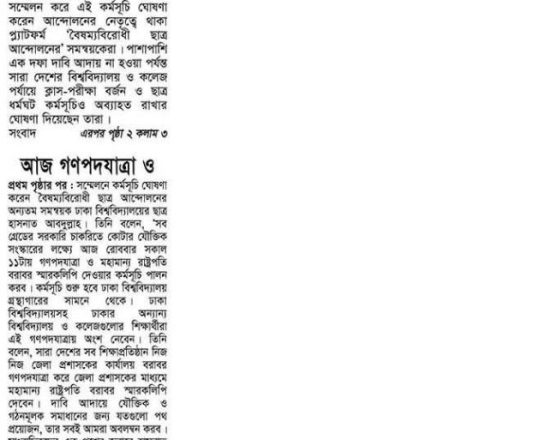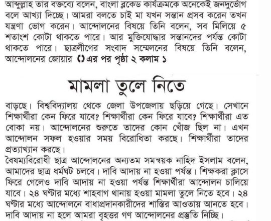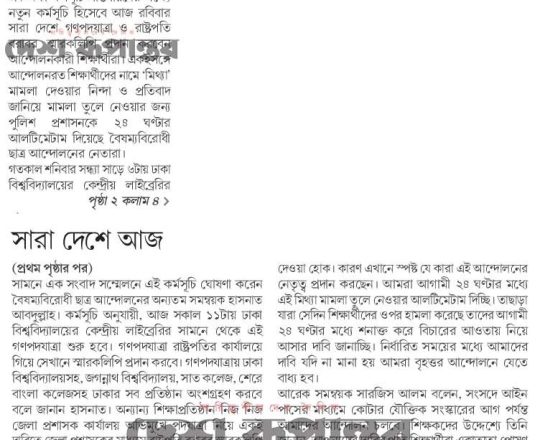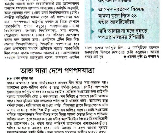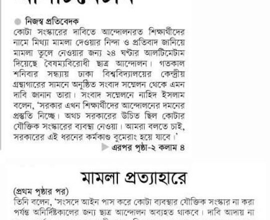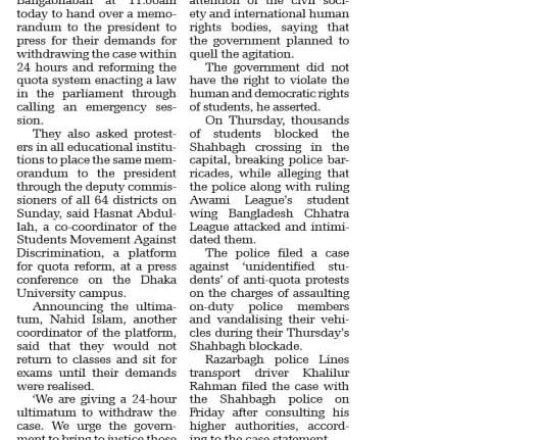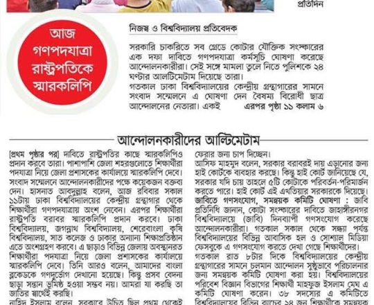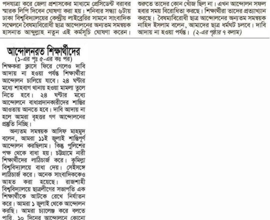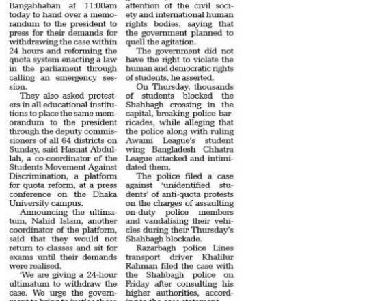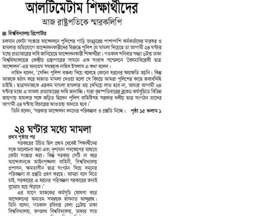 বাংলাদেশ প্রতিদিন, ১৪ জুলাই ২০২৪, আন্দোলনকারীদের আলটিমেটাম