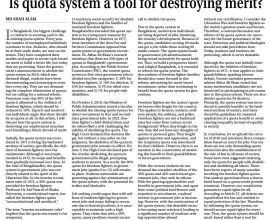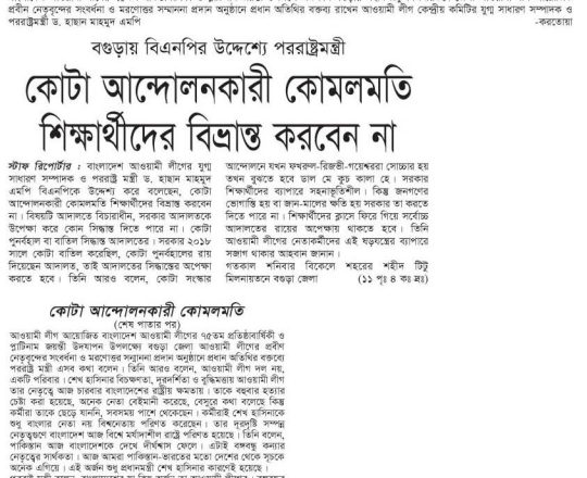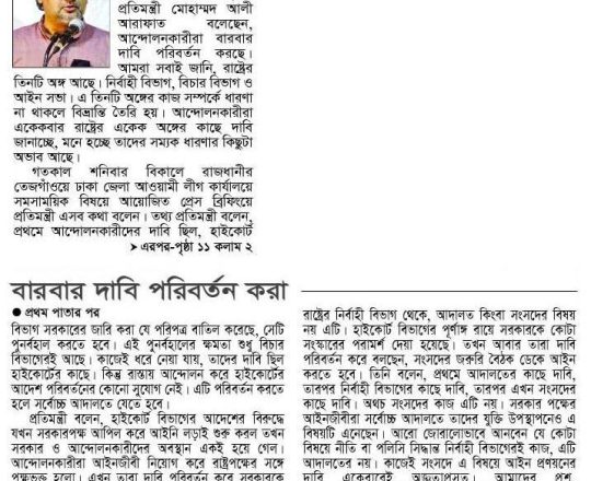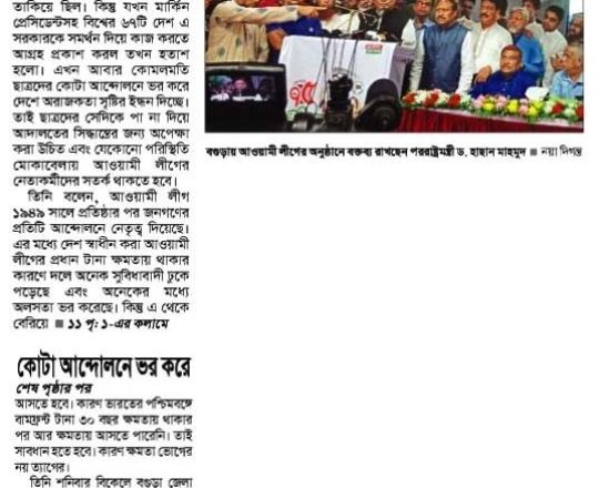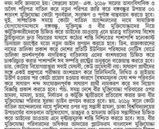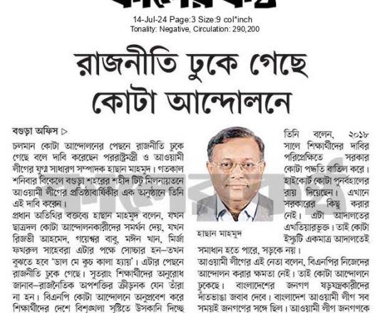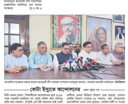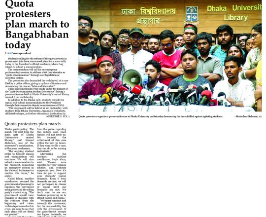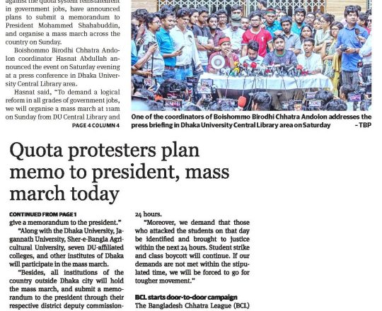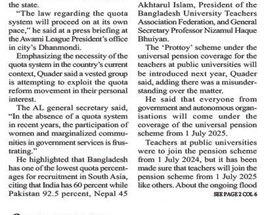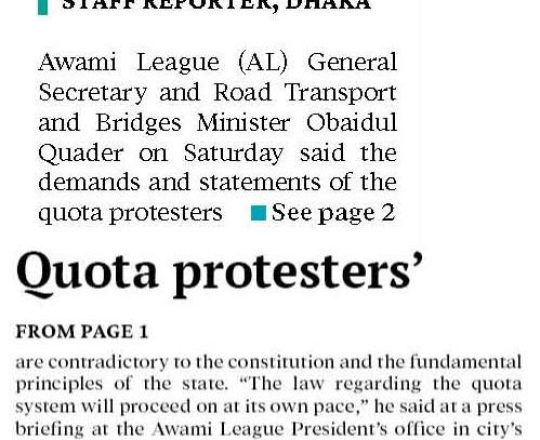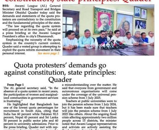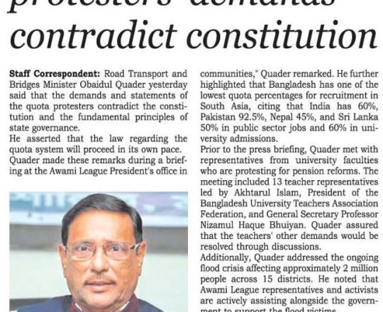 Bangladesh Post, 14 july 2024, Quota protesters' demands go against Constitution: AL