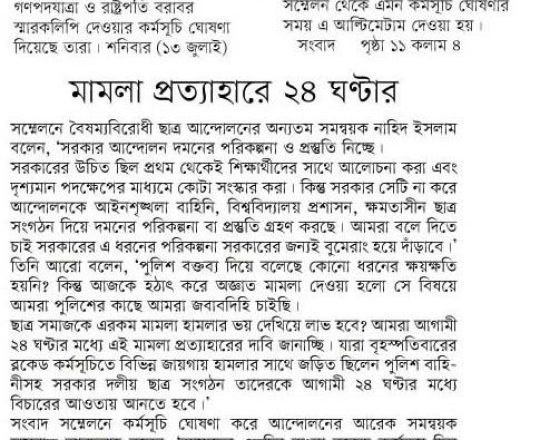 দৈনিক সংগ্রাম, ১৪ জুলাই ২০২৪, মামলা প্রত্যাহারে ২৪ ঘণ্টার আলটিমেটাম আন্দোলনরত শিক্ষার্থীদের