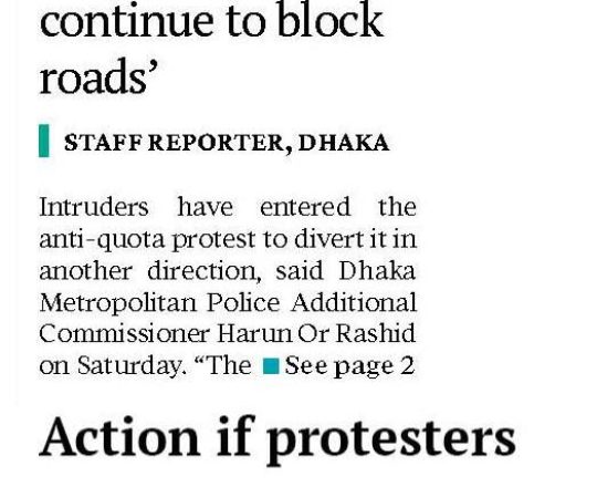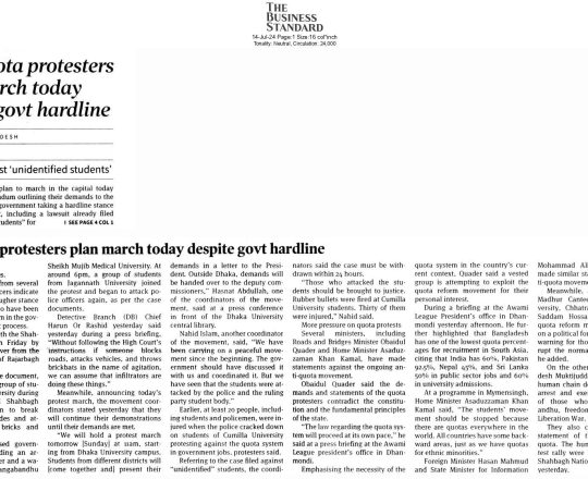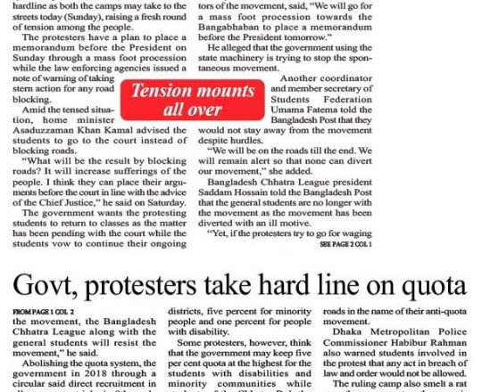 Bangladesh Post, 14 july 2024, Govt, protesters take hard line on quota
