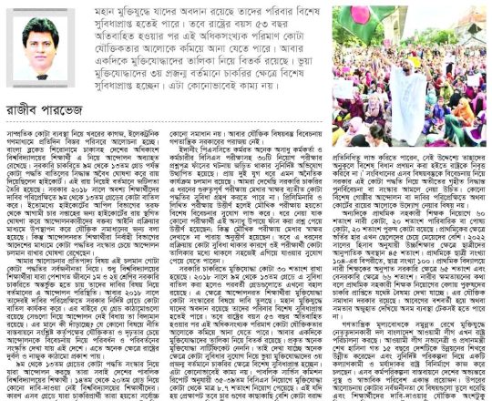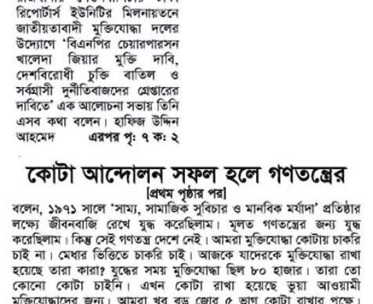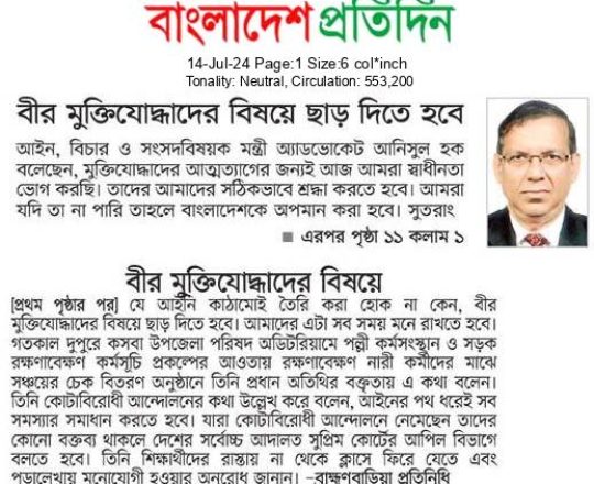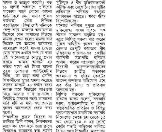 বাংলাদেশ প্রতিদিন, ১৪ জুলাই ২০২৪, বীর মুক্তিযোদ্ধাদের বিষয়ে ছাড় দিতে হবে