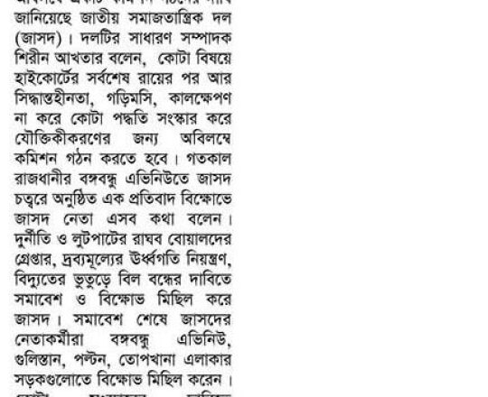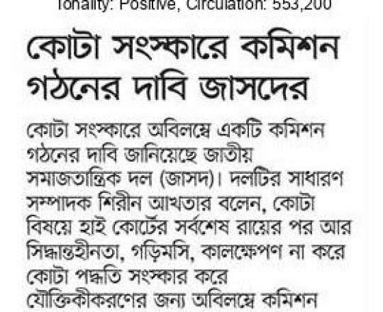 স্বদেশ প্রতিদিন, ১৪ জুলাই ২০২৪, কোটা সংস্কারে কমিশন গঠনের দাবি জাসদের