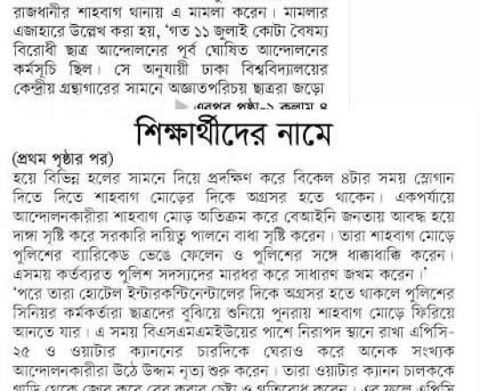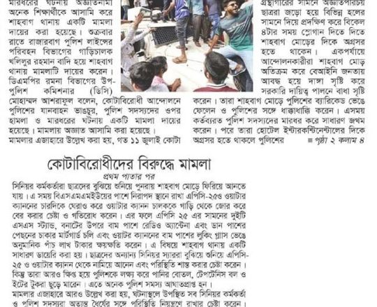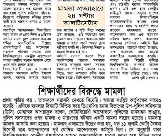 বাংলাদেশ প্রতিদিন, ১৪ জুলাই ২০২৪, শিক্ষার্থীদের বিরুদ্ধে পুলিশের মামলা
