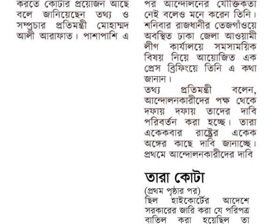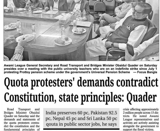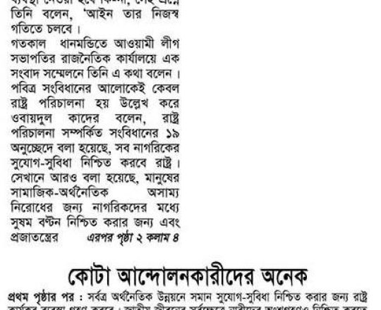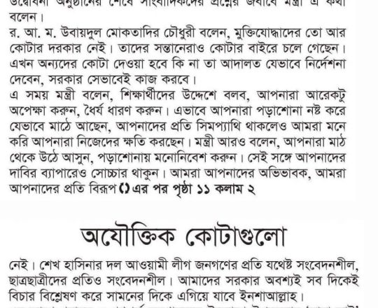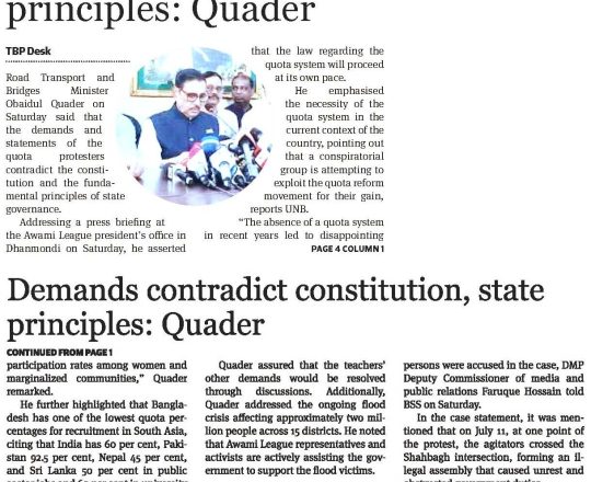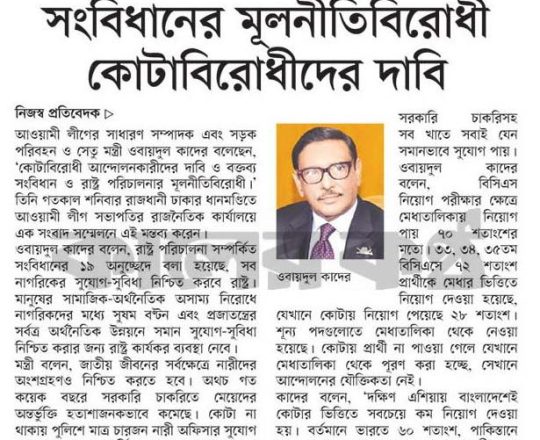 ভোরের পাতা, ১৪ জুলাই ২০২৪, কোটাবিরোধীদের দাবি ও বক্তব্য রাষ্ট্র পরিচালনার মূলনীতি বিরোধী ওবায়দুল কাদের