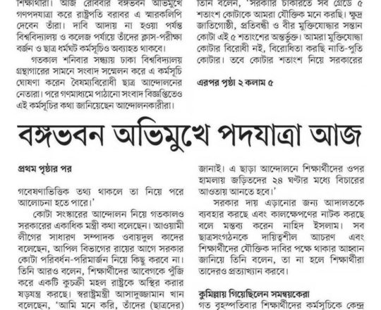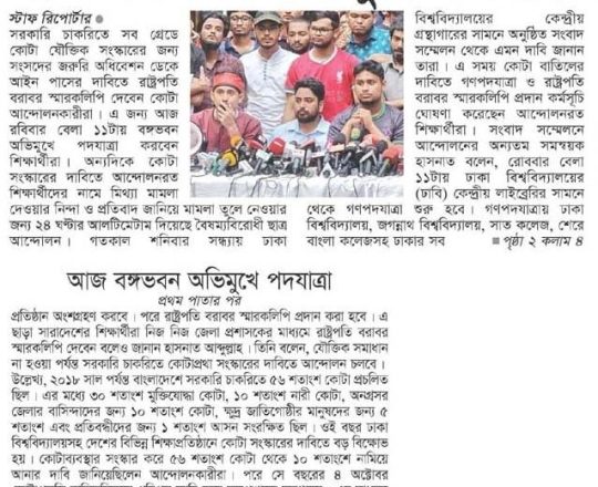 প্রথম আলো, ১৪ জুলাই, কোটা সংস্কারের দাবিতে ঢাকা বিশ্ববিদ্যালয় থেকে বঙ্গভবন অভিমুখে গণপদযাত্রা শুরু