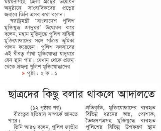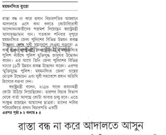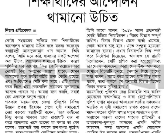প্রথম আলো, ১৪ জুলাই ২০২৪, ছাত্রদের আন্দোলন থামানো উচিত -স্বরাষ্ট্রমন্ত্রী