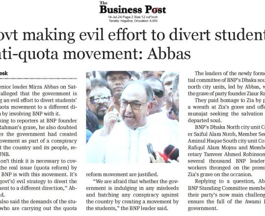 বাংলাদেশ প্রতিদিন, ১৪ জুলাই ২০২৪, সরকার ভিন্ন কিছু করার পাঁয়তারা করছে: আব্বাস