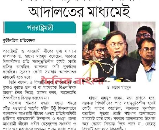 আমাদেরসময়, ১৪ জুলাই ২০২৪, আদালতের মাধ্যমেই হতে হবে কোটা সমস্যার সমাধান -পররাষ্ট্রমন্ত্রী