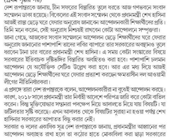 দৈনিক সংগ্রাম, ১৪ জুলাই ২০২৪, কোটা আন্দোলনের প্রাথমিক বিজয়: প্রধানমন্ত্রীর চীন সফরের প্রাপ্তি নিয়ে জল্পনা-কল্পনা