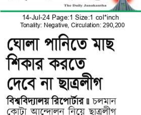 আজকের পত্রিকা, ১৪ জুলাই ২০২৪, কোটা নিয়ে ঘোলা পানিতে মাছ শিকারের চেষ্টা: ছাত্রলীগ