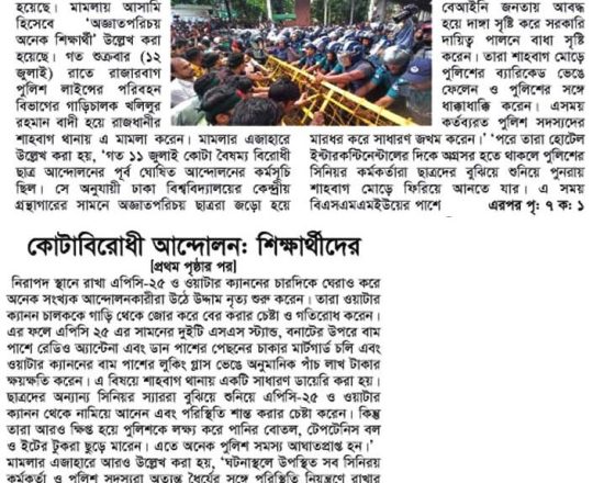 প্রতিদিনের সংবাদ, ১৪ জুলাই ২০২৪, কোটা সংস্কার আন্দোলনকারীদের বিরুদ্ধে পুলিশের মামলা