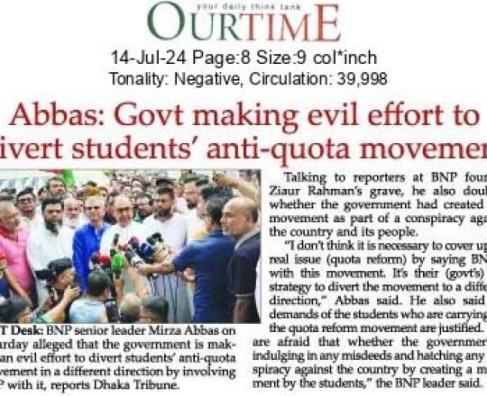 Our Time, 14 july 2024, Govt making evil effort to divert students' anti-quota movement-Abbas