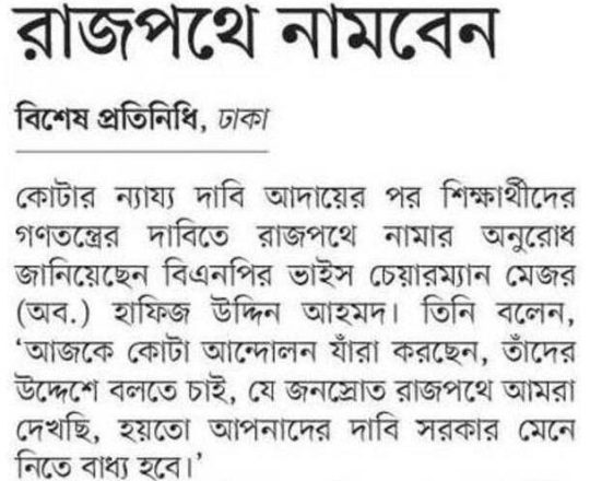 প্রথম আলো, ১৪ জুলাই ২০২৪, গণতন্ত্রের দাবিতেও রাজপথে নামবেন -হাফিজ