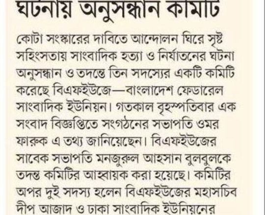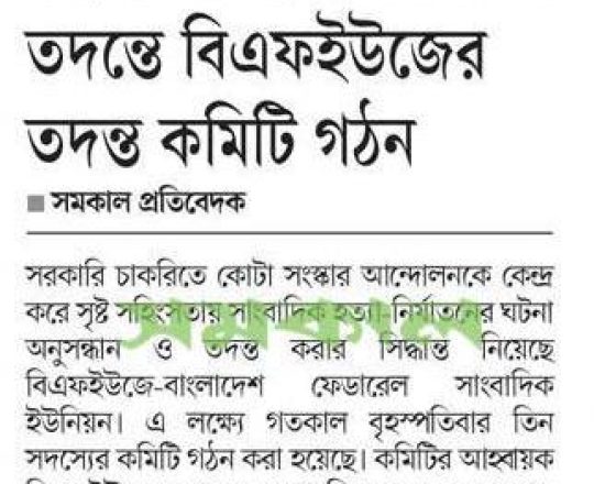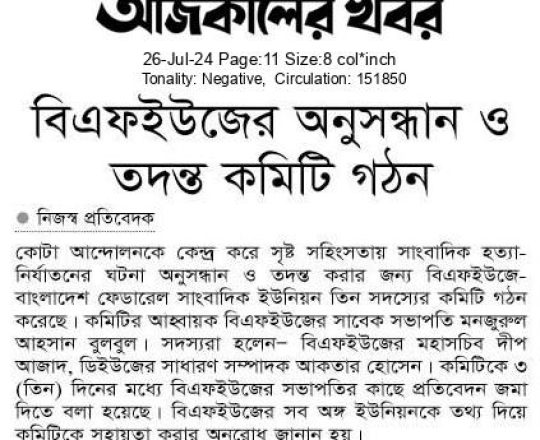 আজকালের খবর, ২৬ জুলাই ২০২৪, বিএফইউজের অনুসন্ধান ও তদন্ত কমিটি গঠন