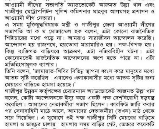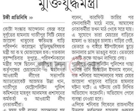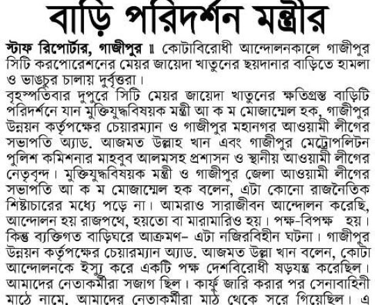 আজকালের খবর, ২৬ জুলাই ২০২৪, দুর্বৃত্তের হামলায় ক্ষতিগ্রস্ত মেয়র জায়েদার বাড়িতে মুক্তিযুদ্ধবিষয়ক মন্ত্রী