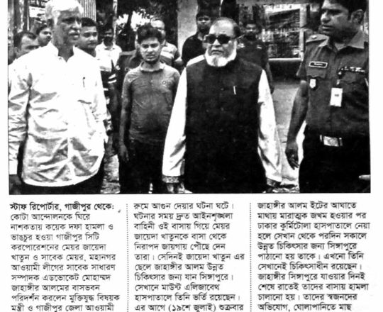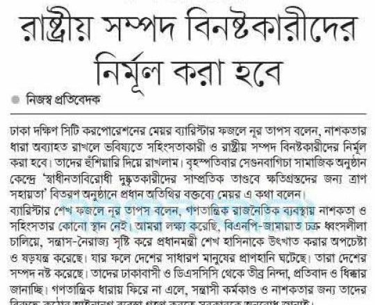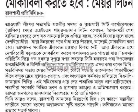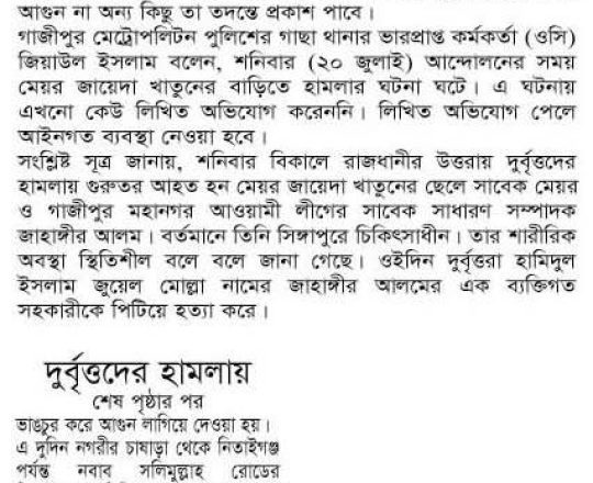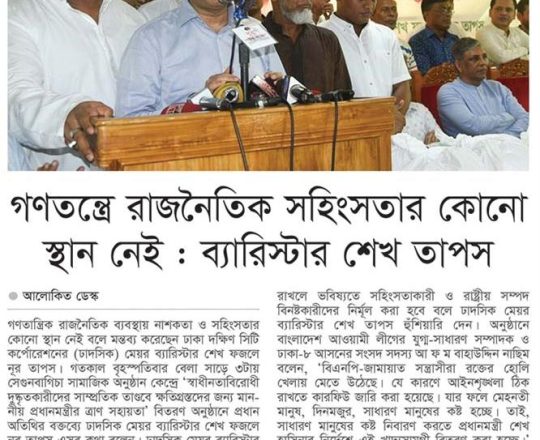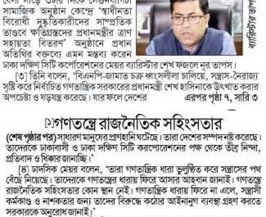 সংগ্রাম, ২৬ জুলাই ২০২৪, গণতন্ত্রে রাজনৈতিক সহিংসতার কোনো স্থান নেই মেয়র তাপস